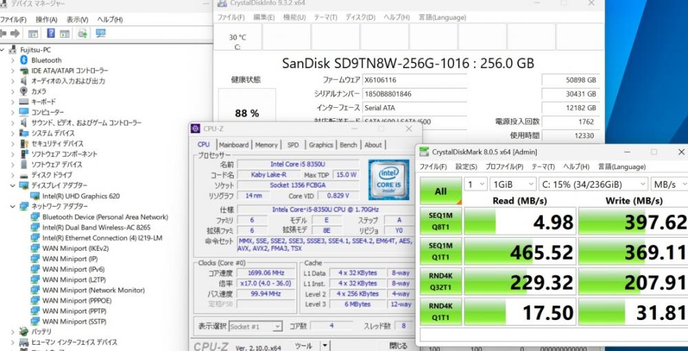 CPU:    超高速 Intel 高性能 第8世代Core i5-8350u 1.7Ghz、 4コア8スレッド (ターボ・ブースト利用時の最大周波数 3.6GHz)