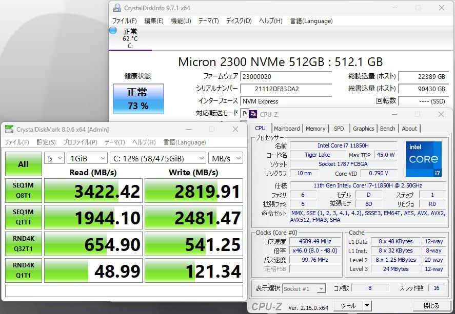 CPU:    超高速 Intel 8コア 卓越性能 第11世代Core i7-11850H 2.5Ghz、 8コア16スレッド (ターボ・ブースト利用時の最大周波数 4.8GHz)