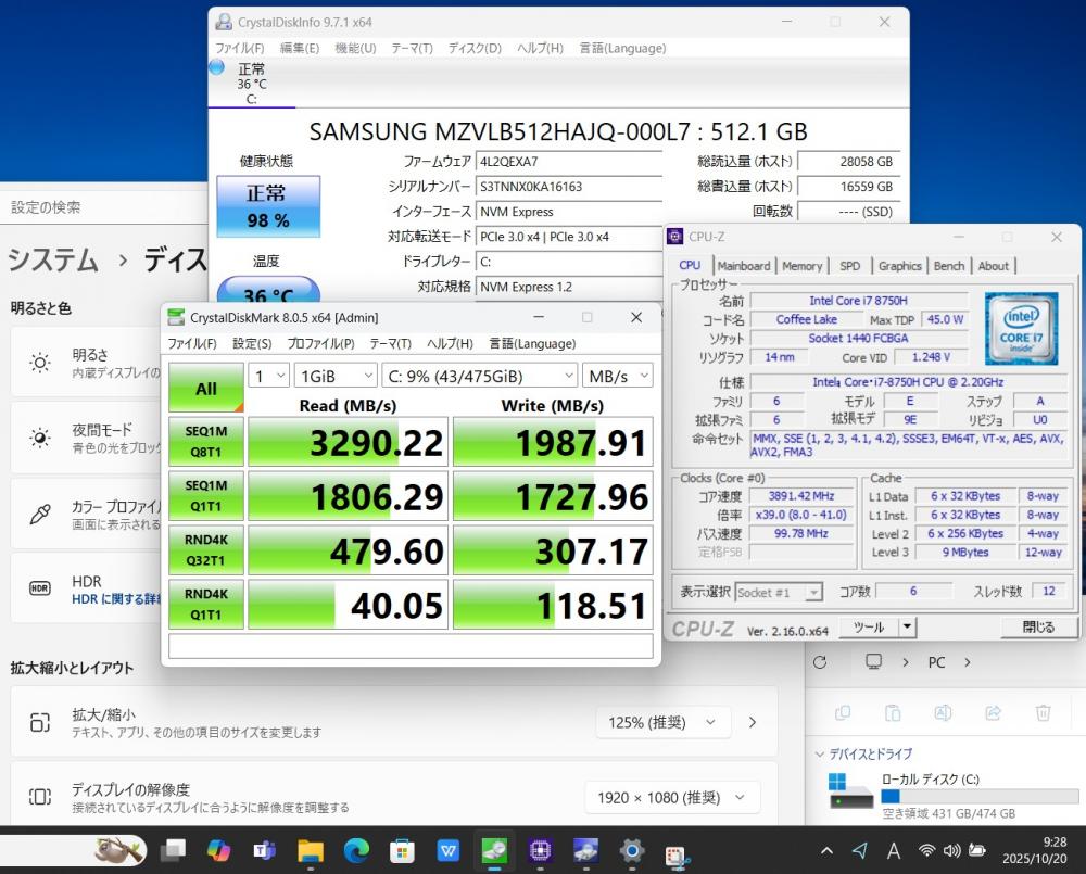 | CPU: 超高速 Intel 高性能 第8世代Core i7-8750H 2.2Ghz、 6コア12スレッド (ターボ・ブースト利用時の最大周波数 4.1GHz) |