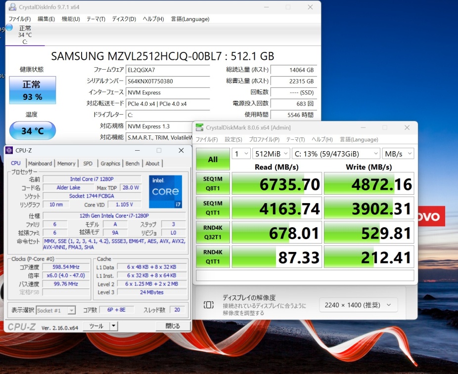 | CPU: 超高速 Intel 12コア 卓越性能 第12世代Core i7-1280P 1.8Ghz、 12コア20スレッド (ターボ・ブースト利用時の最大周波数 4.8GHz) |