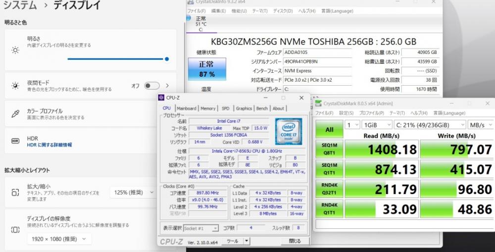 | CPU: 超高速 Intel 高性能 第8世代Core i7-8565u 1.8Ghz、 4コア8スレッド (ターボ・ブースト利用時の最大周波数 4.6GHz) |