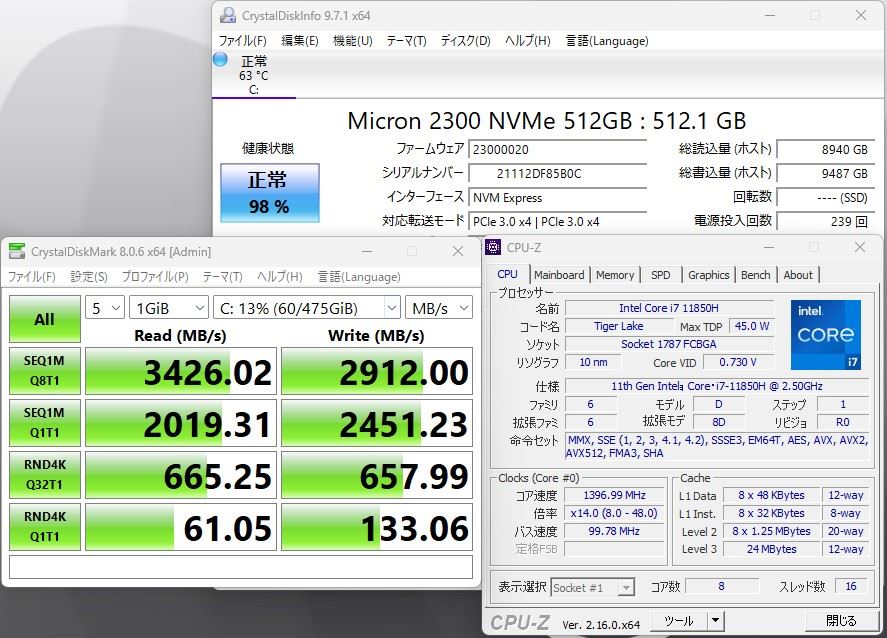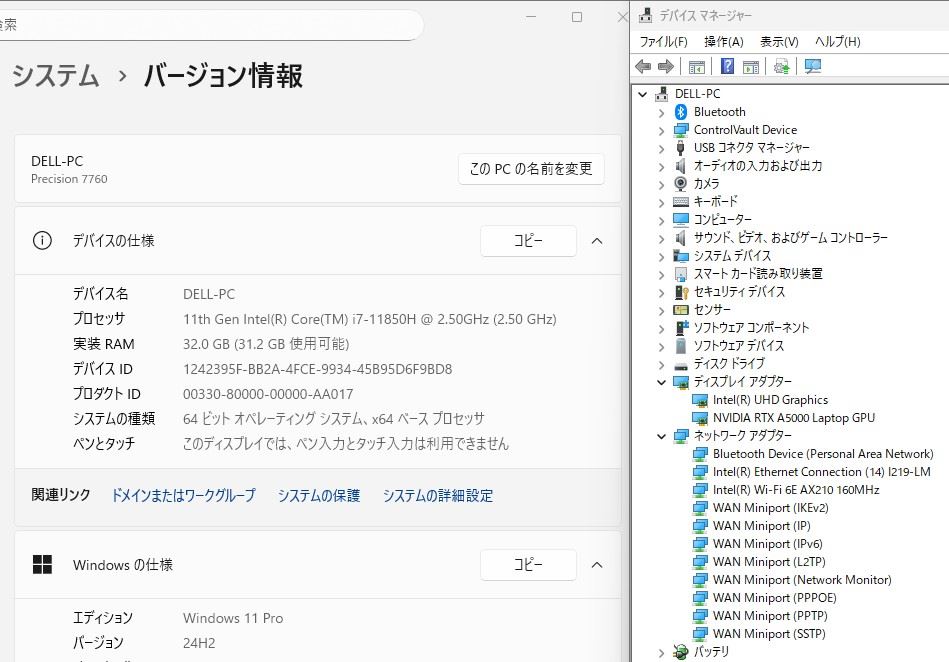 | CPU:    超高速 Intel  8コア 卓越性能 第11世代Core i7-11850H 2.5Ghz、 8コア16スレッド (ターボ・ブースト利用時の最大周波数 4.8GHz) |
