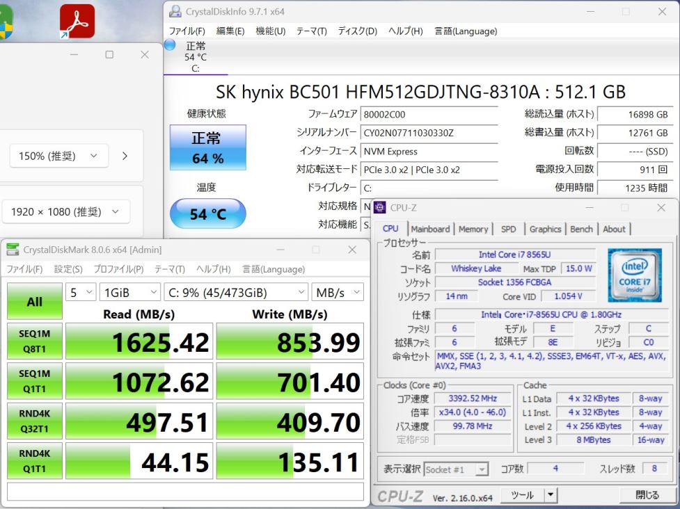 | CPU:    超高速 Intel  高性能 第8世代Core i7-8565U 1.8Ghz、 4コア8スレッド (ターボ・ブースト利用時の最大周波数 4.6GHz) |