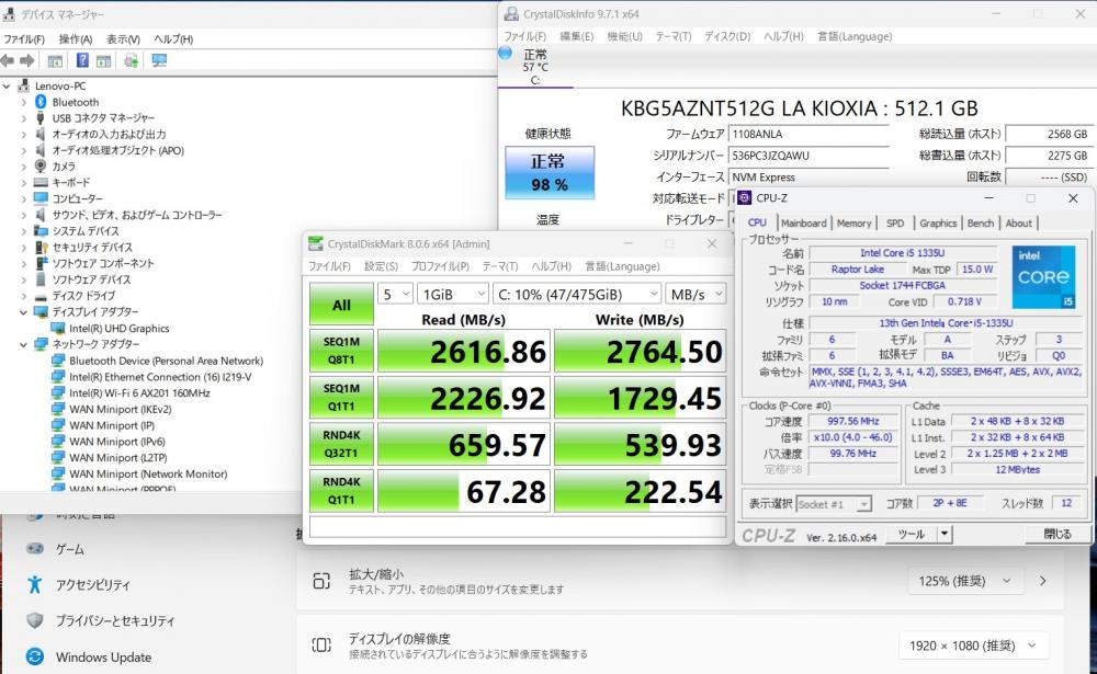 | CPU: 超高速 Intel 10コア 卓越性能 第13世代Core i5-1335U 1.3Ghz、 10コア12スレッド (ターボ・ブースト利用時の最大周波数 4.6GHz) |