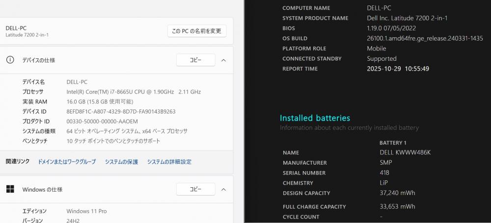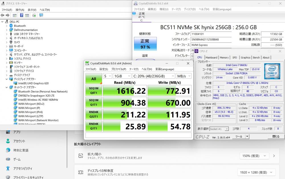| CPU: 超高速 Intel 高性能 第8世代Core i7-8665U 1.9Ghz、 4コア8スレッド (ターボ・ブースト利用時の最大周波数 4.8GHz) |