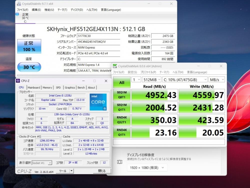 | CPU: 超高速 Intel 10コア 卓越性能 第13世代Core i5-1335U 1.3Ghz、 10コア12スレッド (ターボ・ブースト利用時の最大周波数 4.6GHz) |