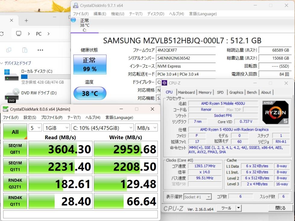 CPU:    超高速 高性能 AMD Ryzen 5-4500U 2.3Ghz、 6コア (ターボ・ブースト利用時の最大周波数 4.0GHz)