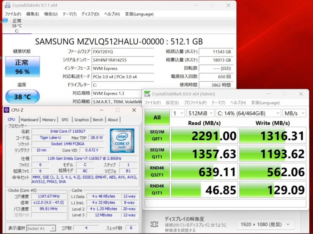 CPU:    超高速 Intel 卓越性能 第11世代Core i7-1165G7 2.8Ghz、 4コア8スレッド (ターボ・ブースト利用時の最大周波数 4.7GHz)