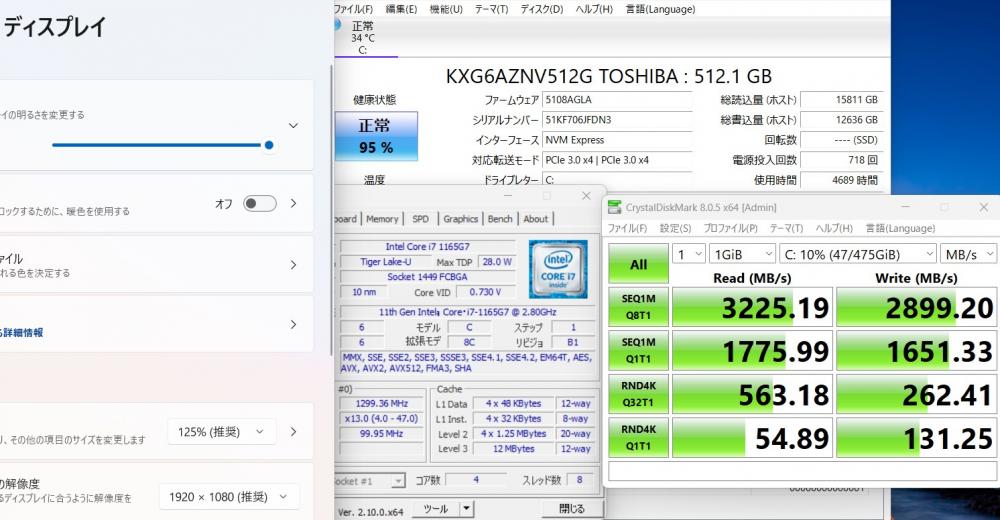 CPU:    超高速 Intel 卓越性能 第11世代Core i7-1165G7 2.8Ghz、 4コア8スレッド (ターボ・ブースト利用時の最大周波数 4.7GHz)