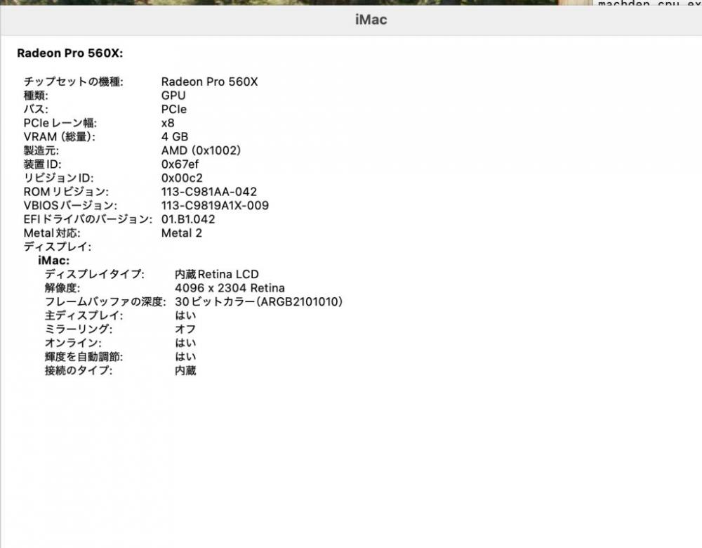 | ディスプレイ: 4K対応 21.5インチ光沢液晶 高輝度 広視野角 LEDバックライト 4096 x 2304解像度 Retina ディスプレイ搭載により文字や写真を滑らかに表現することができます。 グラフィックス Radeon Pro 560X 搭載、大容量 4096M専用ビデオメモリーvRAM 快適使用体験! 専門向けのグラフィックスですが、ゲーミング性能にも、NVIDIA GTX 650Ti < Radeon Pro 560X < NVIDIA GTX 750Ti |