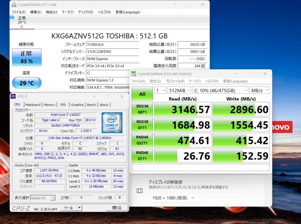 | CPU: 超高速 Intel 卓越性能 第11世代Core i7-1165G7 2.8Ghz、 4コア8スレッド (ターボ・ブースト利用時の最大周波数 4.7GHz) |