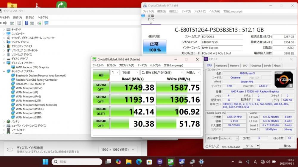 | CPU: 超高速 高性能 AMD Ryzen 5-7530u 2.0Ghz、 6コア12スレッド (ターボ・ブースト利用時の最大周波数 4.5GHz) |