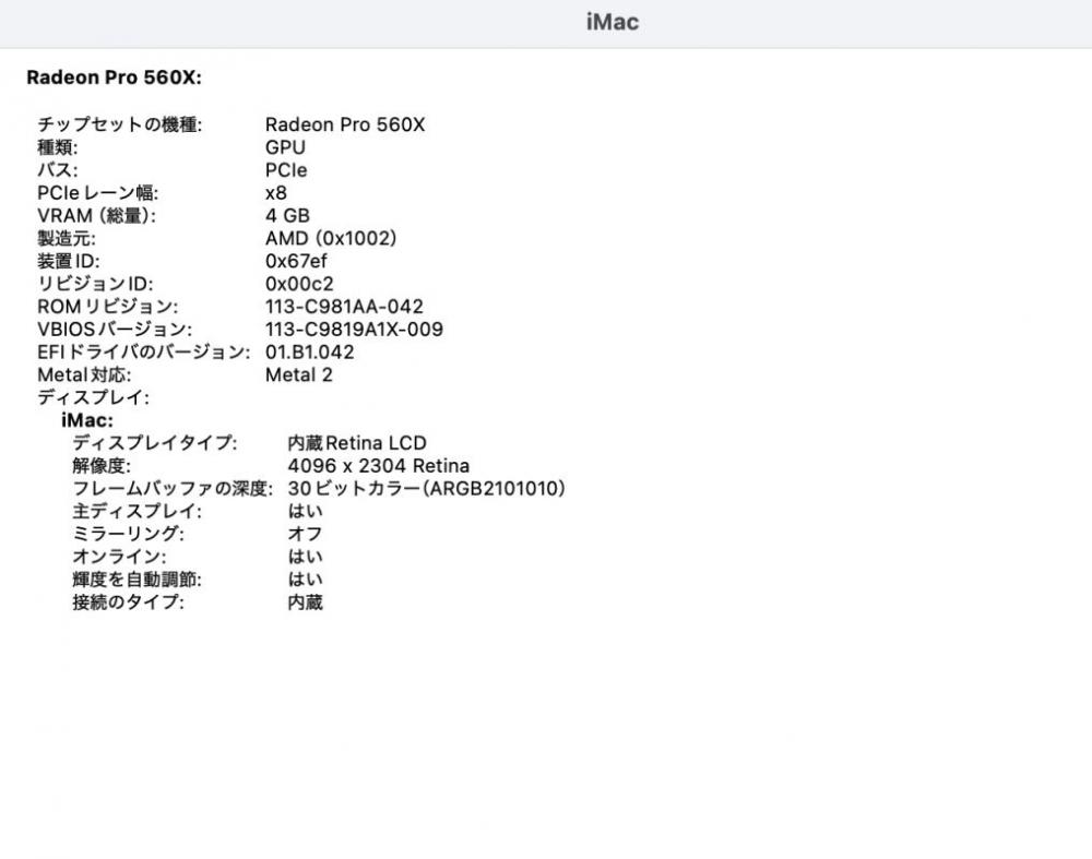 | ディスプレイ: 4K対応 21.5インチ光沢液晶 高輝度 広視野角 LEDバックライト 4096 x 2304解像度 Retina ディスプレイ搭載により文字や写真を滑らかに表現することができます。 グラフィックス Radeon Pro 560X 搭載、大容量 4096M専用ビデオメモリーvRAM 快適使用体験! 専門向けのグラフィックスですが、ゲーミング性能にも、NVIDIA GTX 650Ti < Radeon Pro 560X < NVIDIA GTX 750Ti |