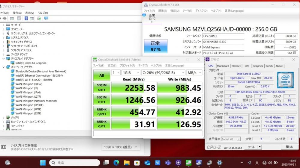 | CPU: 超高速 Intel 卓越性能 第11世代Core i5-1135g7 2.4Ghz、 4コア8スレッド (ターボ・ブースト利用時の最大周波数 4.2GHz) |