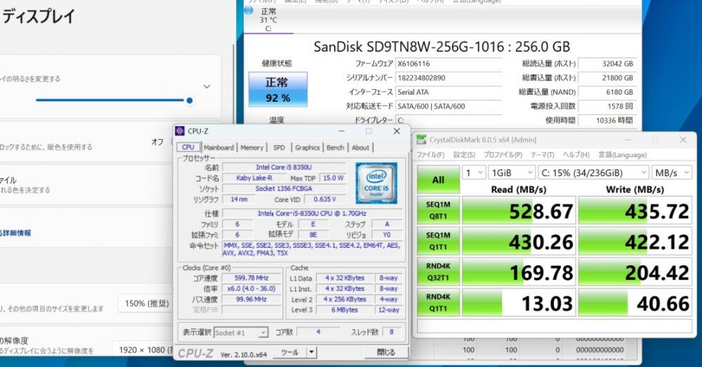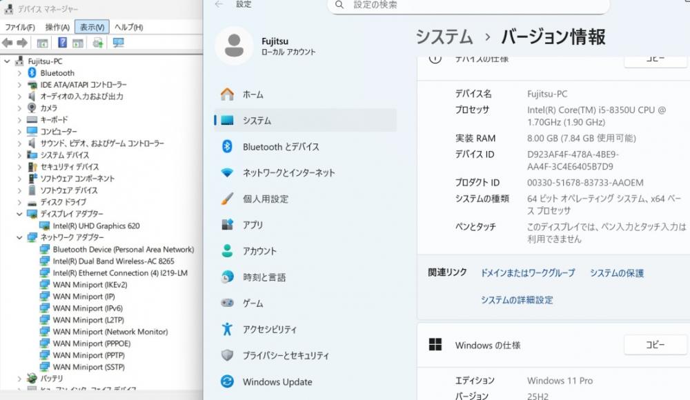 CPU:    超高速 Intel 高性能 第8世代Core i5-8350u 1.7Ghz、 4コア8スレッド (ターボ・ブースト利用時の最大周波数 3.6GHz)