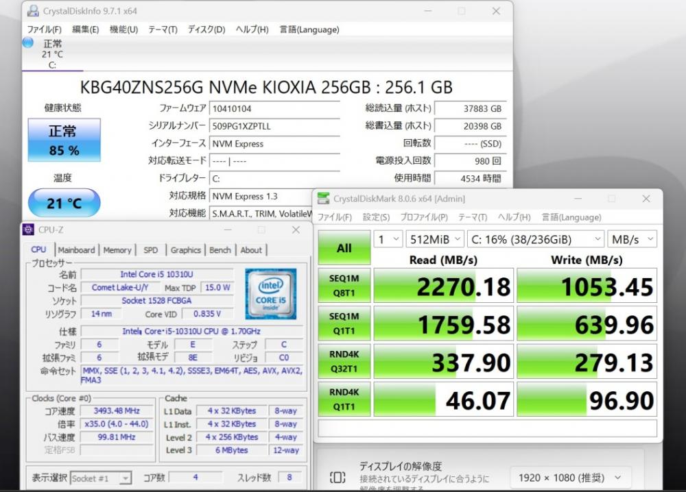 | CPU: 超高速 Intel 超高性能 第10世代Core i5-10310U 1.7Ghz、 4コア8スレッド (ターボ・ブースト利用時の最大周波数 4.4GHz) |