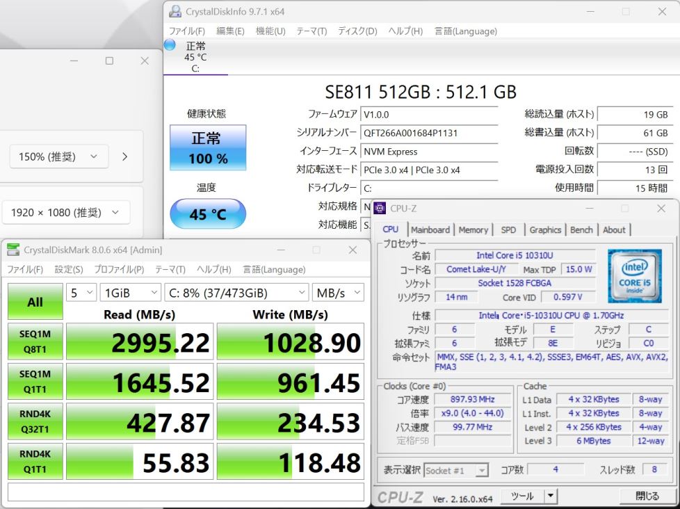 | CPU: 超高速 Intel 超高性能 第10世代Core i5-10310U 1.7Ghz、 4コア8スレッド (ターボ・ブースト利用時の最大周波数 4.4GHz) |