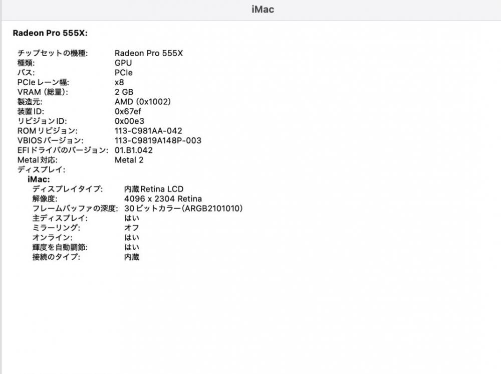 | ディスプレイ: 4K対応 21.5インチ光沢液晶 高輝度 広視野角 LEDバックライト 4096 x 2304解像度 Retina ディスプレイ搭載により文字や写真を滑らかに表現することができます。 グラフィックス Radeon Pro 555X 搭載、大容量 2048M専用ビデオメモリーvRAM 快適使用体験! 専門向けのグラフィックスですが、ゲーミング性能にも、NVIDIA GT 1030 < Radeon Pro 555X < NVIDIA GTX 650Ti |