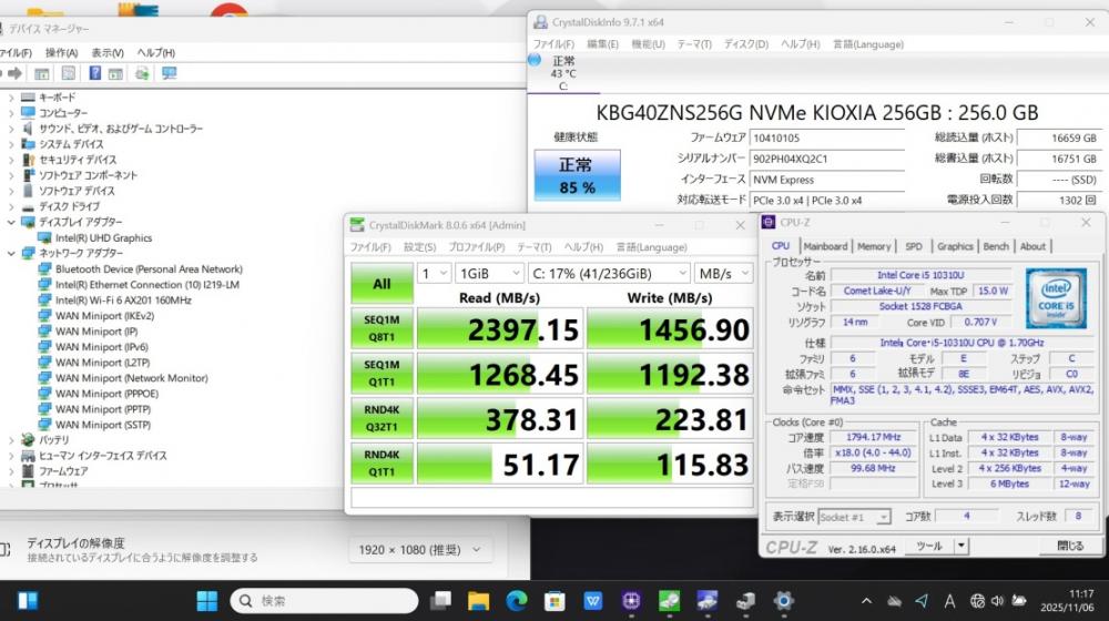 | CPU: 超高速 Intel 超高性能 第10世代Core i5-10310u 1.7Ghz、 4コア8スレッド (ターボ・ブースト利用時の最大周波数 4.4GHz) |
