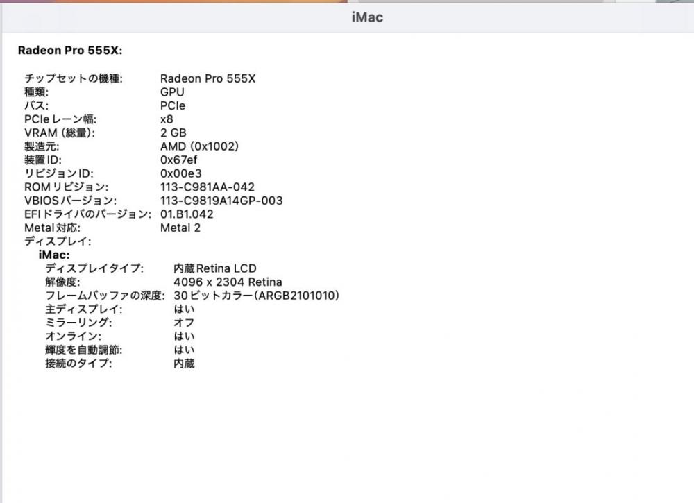 | ディスプレイ: 4K対応 21.5インチ光沢液晶 高輝度 広視野角 LEDバックライト 4096 x 2304解像度 Retina ディスプレイ搭載により文字や写真を滑らかに表現することができます。 グラフィックス Radeon Pro 555X 搭載、大容量 4096M専用ビデオメモリーvRAM 快適使用体験! 専門向けのグラフィックスですが、ゲーミング性能にも、NVIDIA GT 1030 < Radeon Pro 555X < NVIDIA GTX 650Ti |