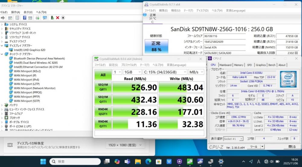 CPU:    超高速 Intel 高性能 第8世代Core i5-8350u 1.7Ghz、 4コア8スレッド (ターボ・ブースト利用時の最大周波数 3.6GHz)
