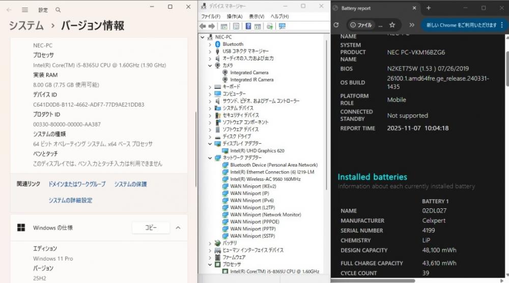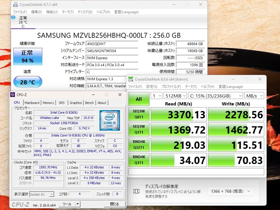 | CPU: 超高速 Intel 高性能 第8世代Core i5-8365U 1.6Ghz、 4コア8スレッド (ターボ・ブースト利用時の最大周波数 4.1GHz) |