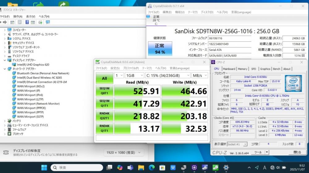 | CPU: 超高速 Intel 高性能 第8世代Core i5-8350u 1.7Ghz、 4コア8スレッド (ターボ・ブースト利用時の最大周波数 3.6GHz) |