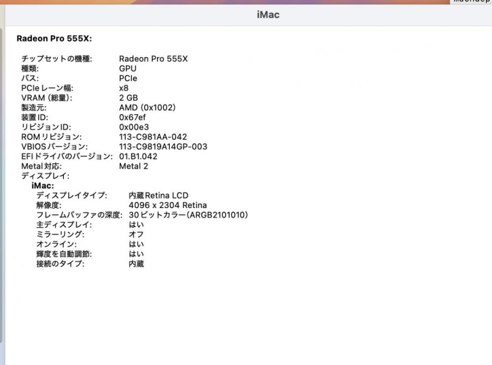 | ディスプレイ: 4K対応 21.5インチ光沢液晶 高輝度 広視野角 LEDバックライト 4096 x 2304解像度 Retina ディスプレイ搭載により文字や写真を滑らかに表現することができます。 グラフィックス Radeon Pro 555X 搭載、大容量 2048M専用ビデオメモリーvRAM 快適使用体験! 専門向けのグラフィックスですが、ゲーミング性能にも、NVIDIA GT 1030 < Radeon Pro 555X < NVIDIA GTX 650Ti |