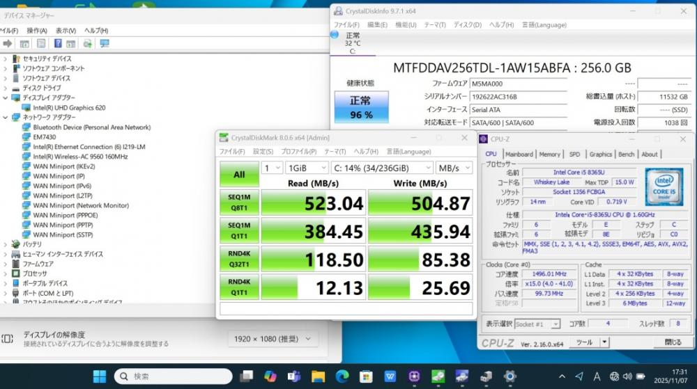 | CPU: 超高速 Intel 高性能 第8世代Core i5-8365u 1.6Ghz、 4コア8スレッド (ターボ・ブースト利用時の最大周波数 4.1GHz) |