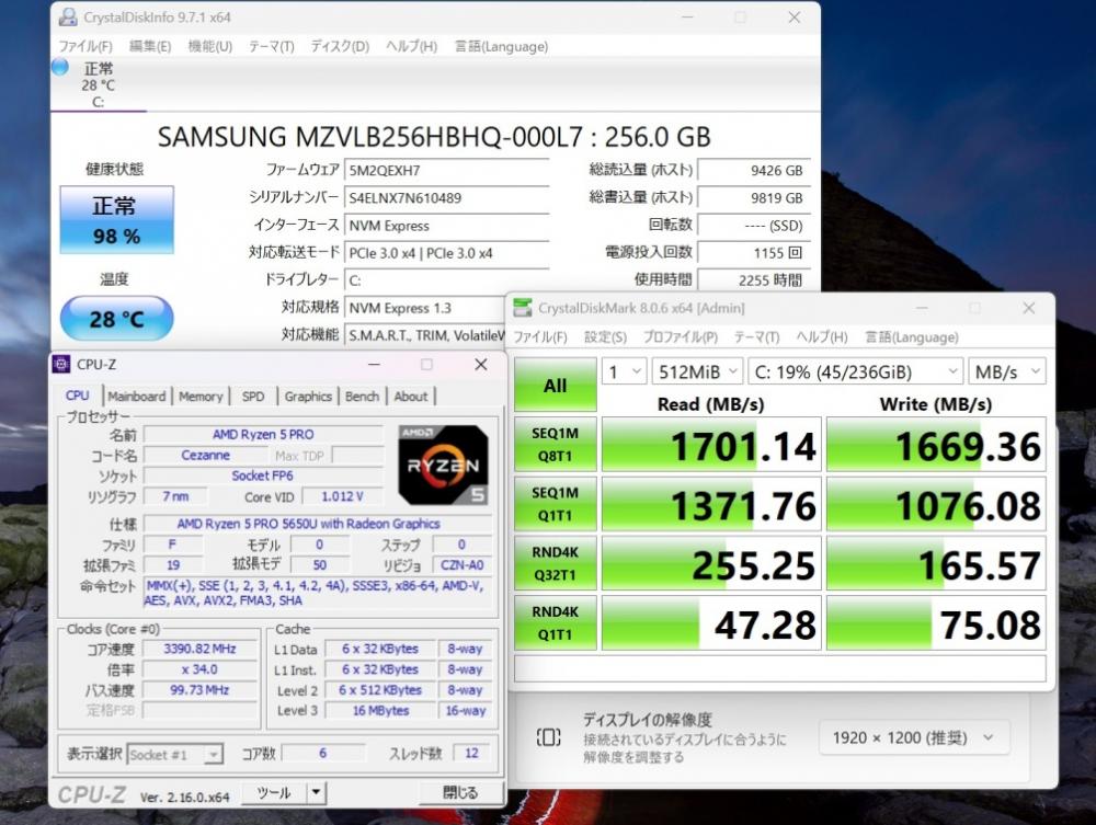| CPU: 高速 AMD Ryzen5 Pro 5650U 2.2Ghz、 6コア12スレッド (ターボ・ブースト利用時の最大周波数 4.2GHz) |