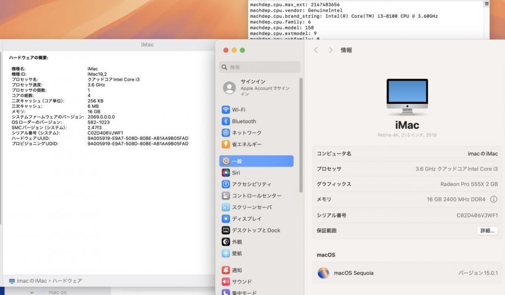 型番:     Apple  iMac A2116 (Retina 4K,2019)