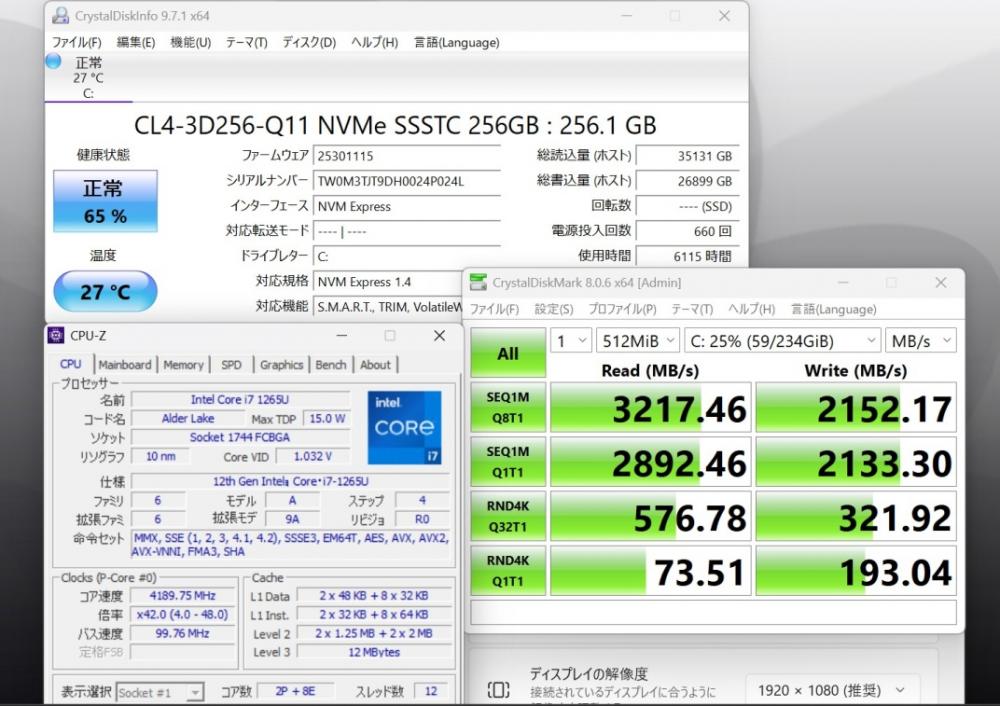 | CPU: 超高速 Intel 10コア 卓越性能 第12世代Core i7-1265U 1.8Ghz、 10コア12スレッド (ターボ・ブースト利用時の最大周波数 4.8GHz) |