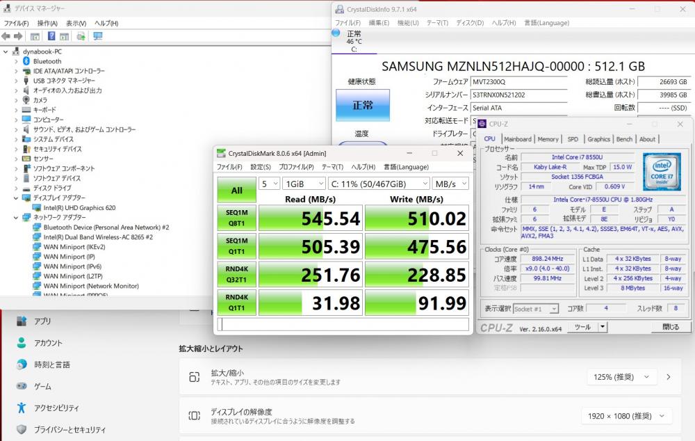 | CPU: 超高速 Intel 高性能 第8世代Core i7-8550U 1.8Ghz、 4コア8スレッド (ターボ・ブースト利用時の最大周波数 4.0GHz) |