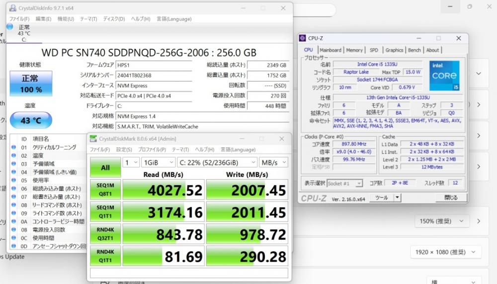 | CPU: 超高速 Intel 10コア 卓越性能 第13世代Core i5-1335u 1.3Ghz、 10コア12スレッド (ターボ・ブースト利用時の最大周波数 4.6GHz) |
