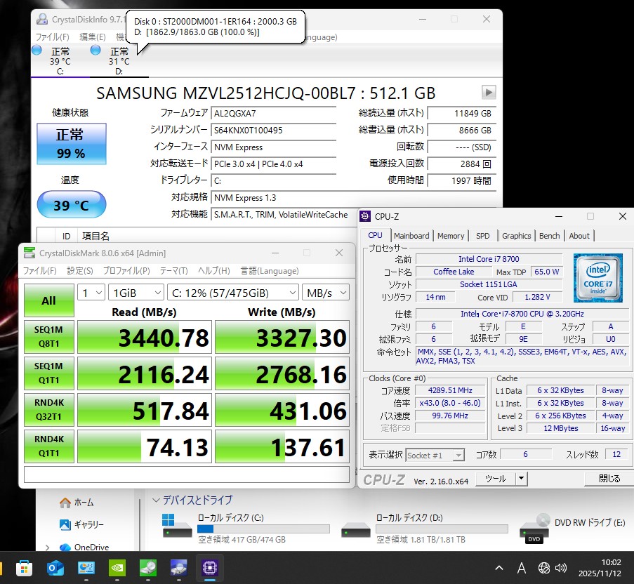 | ハードディスク: (既定の場合) 爆速NVMe式 SSD 512GB超高速ドライブを搭載 +2000GB-HDD 静かで耐衝撃性に優れ、OSやプログラムなどのソフトの起動速度が大幅に高速化します!! |