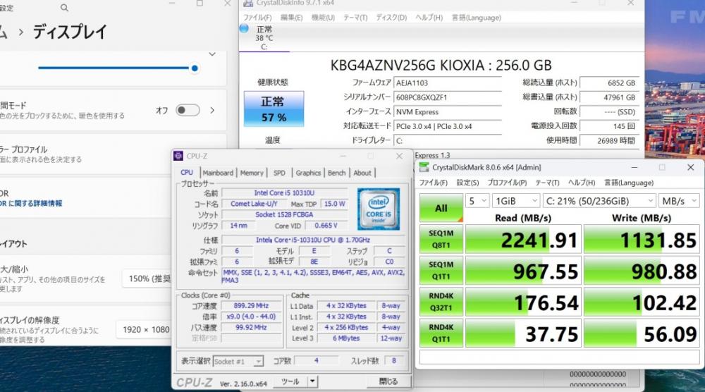 | CPU: 超高速 Intel 超高性能 第10世代Core i5-10310u 1.7Ghz、 4コア8スレッド (ターボ・ブースト利用時の最大周波数 4.4GHz) |