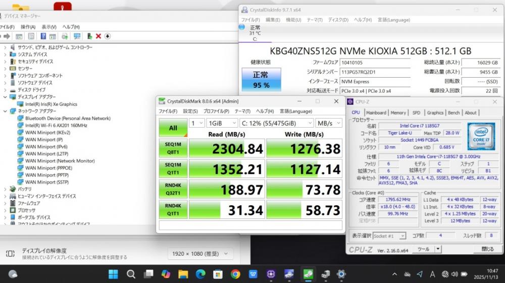 | CPU: 超高速 Intel 卓越性能 第11世代Core i7-1185g7 3.0Ghz、 4コア8スレッド (ターボ・ブースト利用時の最大周波数 4.8GHz) |