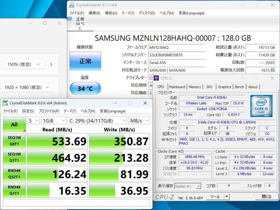 | CPU: 超高速 Intel 高性能 第8世代Core i5-8365U 1.6Ghz、 4コア8スレッド (ターボ・ブースト利用時の最大周波数 4.1GHz) |