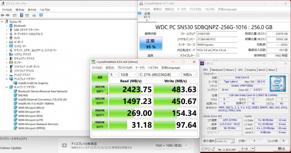 | CPU: 超高速 Intel 卓越性能 第11世代Core i5-1145G7 2.6Ghz、 4コア8スレッド (ターボ・ブースト利用時の最大周波数 4.4GHz) |