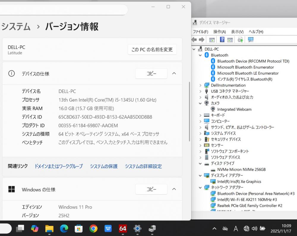 パソコンのメモリーが 2枚で構成の場合は、内蔵グラフィックスの名前は「Intel Xe」表示されます。1枚構成の際その「Intel Xe」は「Intel UHD」の名前として表示します。