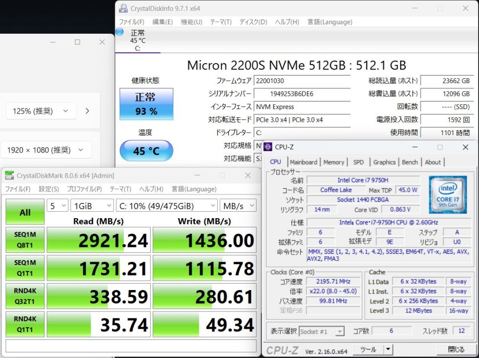 | CPU: 超高速 Intel 超高性能 第9世代Core i7-9750H 2.6Ghz、 6コア12スレッド (ターボ・ブースト利用時の最大周波数 4.5GHz) |