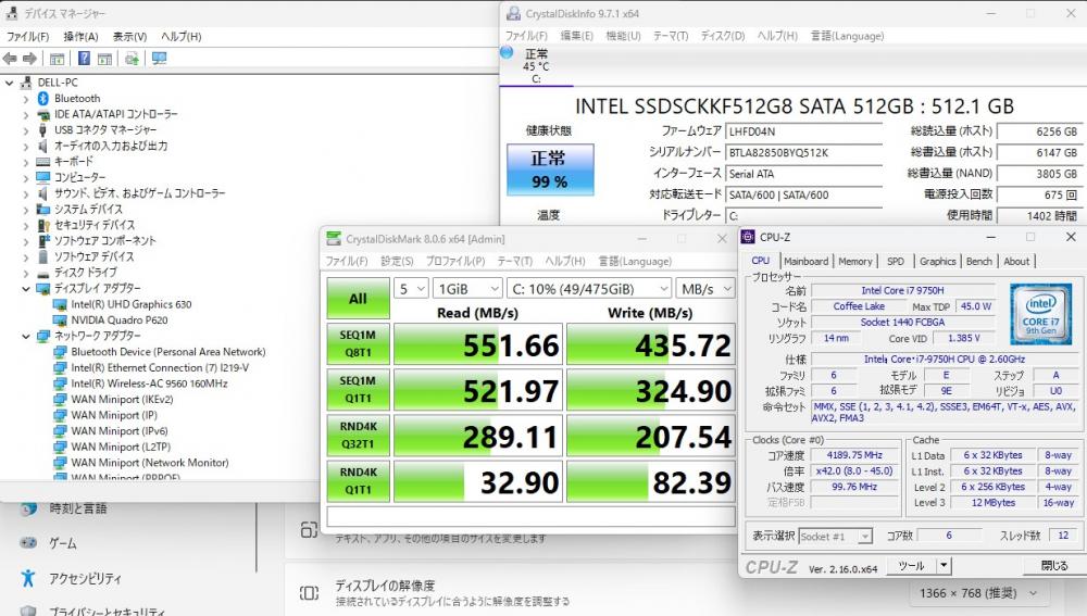 | CPU: 超高速 Intel 超高性能 第9世代Core i7-9750H 2.6Ghz、 6コア12スレッド (ターボ・ブースト利用時の最大周波数 4.5GHz) |