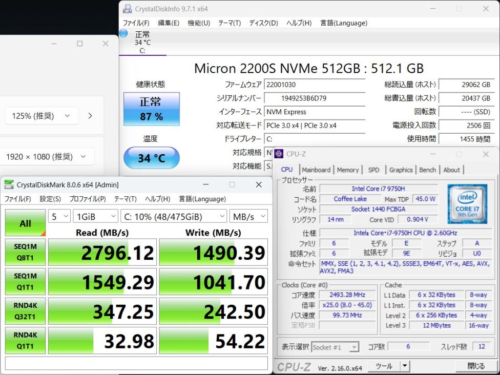 CPU:    超高速 Intel 超高性能 第9世代Core i7-9750H 2.6Ghz、 6コア12スレッド (ターボ・ブースト利用時の最大周波数 4.5GHz)