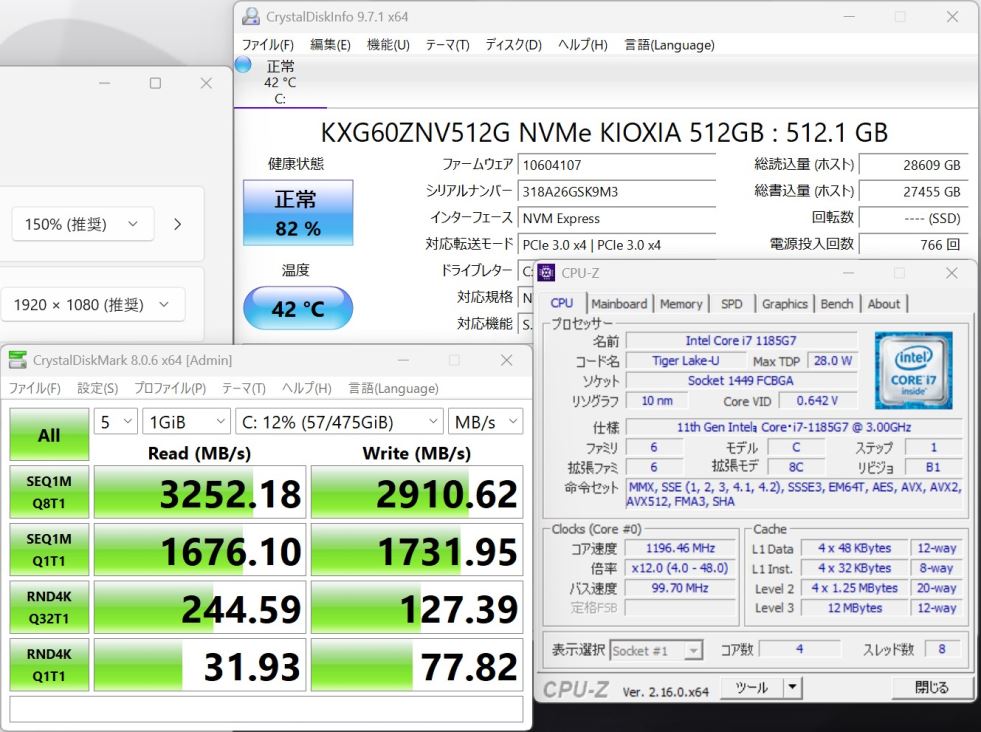 | CPU: 超高速 Intel 卓越性能 第11世代Core i7-1185G7 3.0Ghz、 4コア8スレッド (ターボ・ブースト利用時の最大周波数 4.8GHz) |