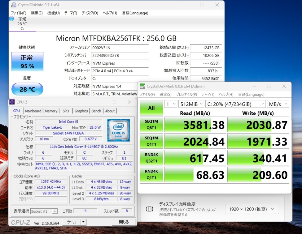 | CPU: 超高速 Intel 卓越性能 第11世代Core i5-1145G7 2.6Ghz、 4コア8スレッド (ターボ・ブースト利用時の最大周波数 4.4GHz) |
