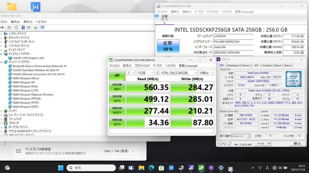 | CPU: 超高速 Intel 高性能 第8世代Core i5-8350u 1.7Ghz、 4コア8スレッド (ターボ・ブースト利用時の最大周波数 3.6GHz) |