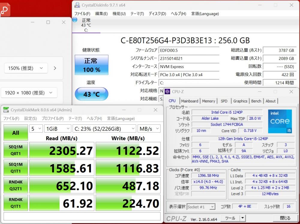 | CPU: 超高速 Intel 12コア 卓越性能 第12世代Core i5-1240P 1.7Ghz、 12コア16スレッド (ターボ・ブースト利用時の最大周波数 4.4GHz) |