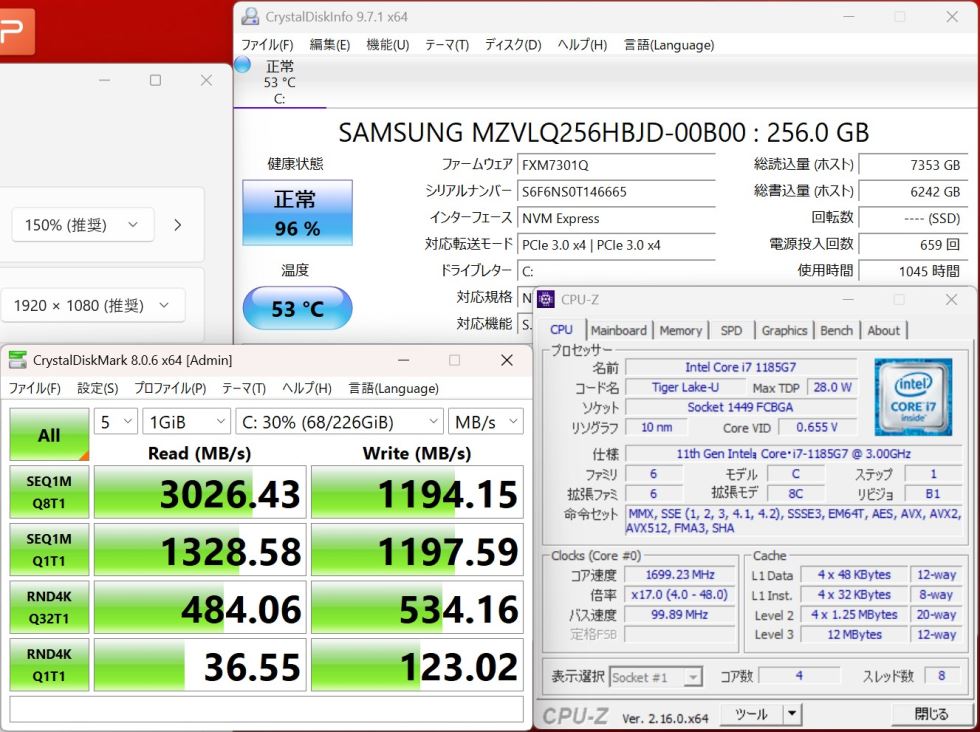 | CPU: 超高速 Intel 卓越性能 第11世代Core i7-1185G7 3.0Ghz、 4コア8スレッド (ターボ・ブースト利用時の最大周波数 4.8GHz) |