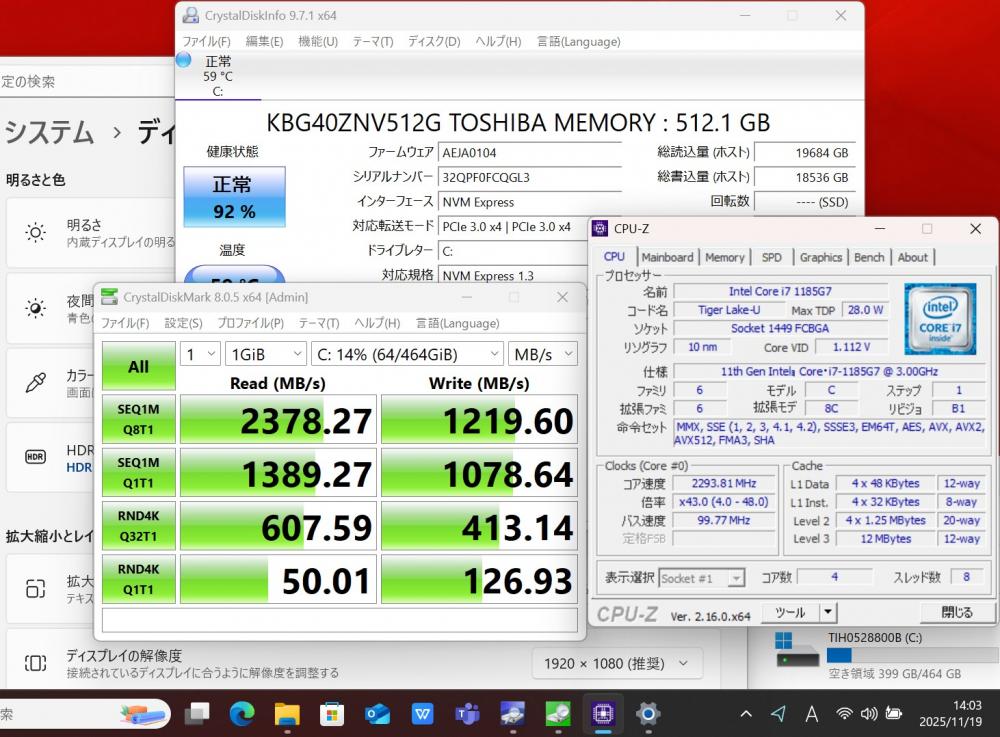 | CPU: 超高速 Intel 卓越性能 第11世代Core i7-1185G7 3.0Ghz、 4コア8スレッド (ターボ・ブースト利用時の最大周波数 4.8GHz) |