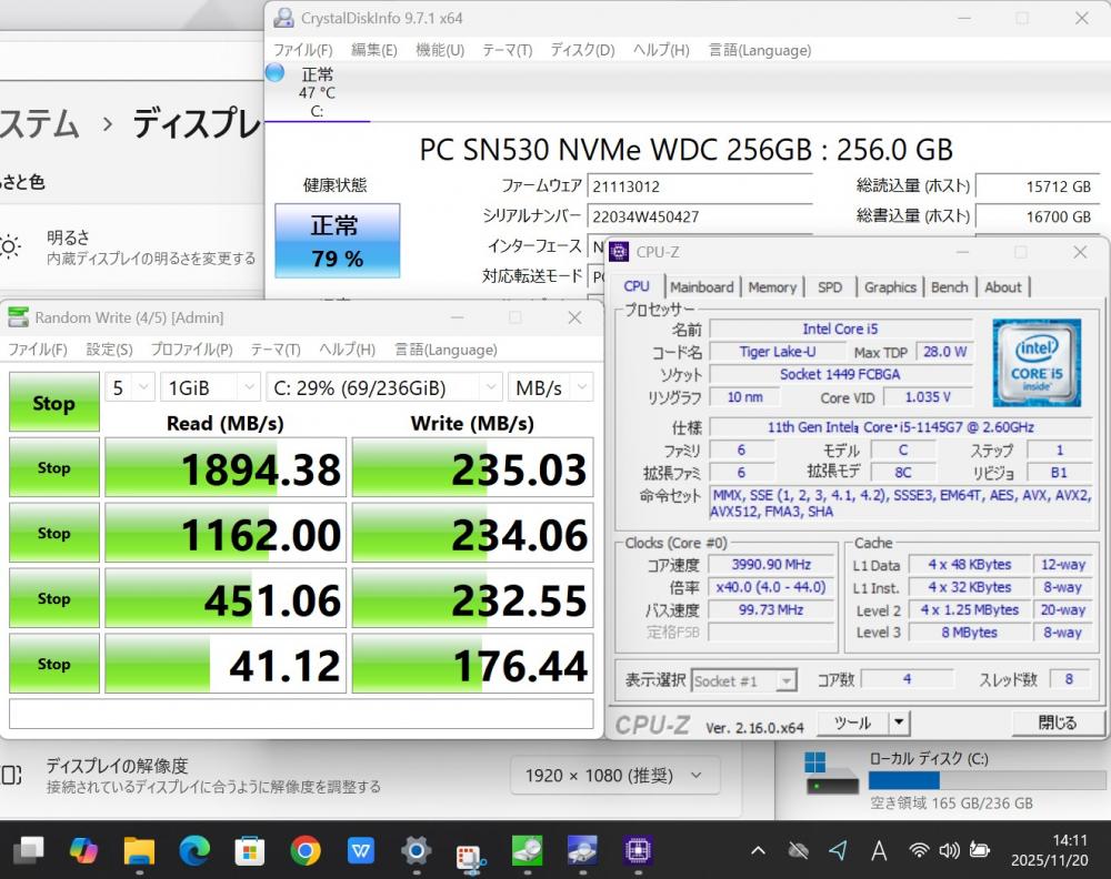 | CPU: 超高速 Intel 卓越性能 第11世代Core i5-1145G7 2.6Ghz、 4コア8スレッド (ターボ・ブースト利用時の最大周波数 4.4GHz) |